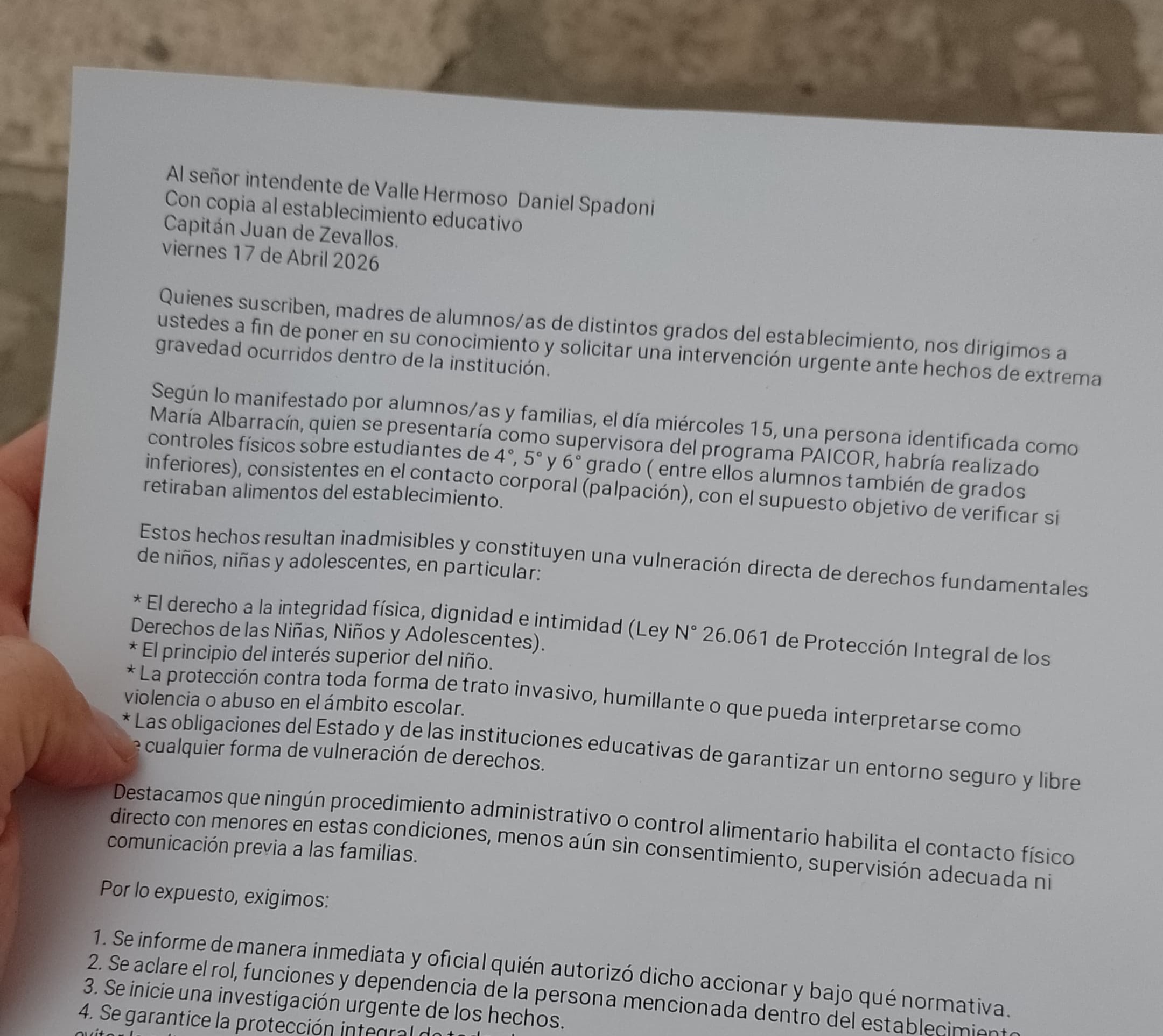 En una convocatoria que reunió a familias, vecinos y miembros de la comunidad educativa, padres y madres de alumnos de la escuela Capitán Juan de Zevallos se concentraron este sábado 18 de abril en la plaza central de Valle Hermoso para visibilizar y reclamar respuestas ante los hechos denunciados días atrás dentro del establecimiento. La protesta se desarrolló de manera pacífica, pero con un mensaje claro: exigir explicaciones, responsabilidades y garantías de que situaciones similares no volverán a ocurrir. El reclamo se origina a partir de los testimonios de estudiantes que señalaron haber sido sometidos a controles físicos al salir del comedor escolar, en el marco del funcionamiento del programa PAICOR. Según relataron las familias, algunos niños —no todos— habrían sido palpados para verificar si llevaban comida o frutas fuera del establecimiento. Este punto es el eje central del conflicto y el que generó mayor preocupación entre los padres, quienes remarcan que, más allá de cualquier control administrativo, “no corresponde que se toque a los chicos”. Durante la reunión en la plaza, las familias expresaron que, si bien reconocen y comprenden la necesidad de ordenar el funcionamiento dentro de la escuela —como evitar que los alumnos coman frutas en el aula, que no se desperdicie comida o que no se arrojen cáscaras en los sanitarios—, consideran que ninguna de estas situaciones justifica la implementación de controles físicos sobre los estudiantes. En ese sentido, también se mencionó que desde la institución educativa se envió una comunicación a los padres explicando la intención de reforzar estos cuidados, particularmente en relación al consumo de alimentos fuera del comedor y al uso adecuado de los espacios escolares. Sin embargo, el foco del reclamo no está puesto en esas medidas, sino en la denuncia puntual de contacto físico hacia algunos alumnos, lo que las familias consideran una práctica inapropiada y que debe ser investigada. “Es la palabra de los chicos contra el sistema”, expresaron algunos padres durante la manifestación, dejando en claro que, ante la falta de explicaciones oficiales contundentes, eligen creer en los testimonios de sus hijos y priorizar su protección. En ese marco, insistieron en que lo sucedido no puede relativizarse ni quedar sin esclarecer. Otro de los puntos que se reiteró durante la jornada fue la falta de asunción de responsabilidades. Según indicaron, hasta el momento ninguna de las partes involucradas —ni el municipio, ni las autoridades del programa PAICOR, ni la institución educativa— ha brindado una respuesta clara ni ha reconocido algún grado de responsabilidad sobre lo ocurrido. Por el contrario, denuncian que existe una tendencia a deslindar el problema, lo que profundiza el malestar y la incertidumbre. Como parte de las acciones previstas, los padres anunciaron que el próximo lunes 20 de abril se harán presentes en la escuela para reunir firmas y acompañar formalmente una nota que será elevada tanto a las autoridades del establecimiento como al intendente Daniel Spadoni. El objetivo es dejar constancia del reclamo colectivo y exigir respuestas oficiales en un plazo concreto. La movilización del sábado dejó en evidencia una preocupación que atraviesa a toda la comunidad educativa y que pone en debate no solo los mecanismos de control dentro de las escuelas, sino también los límites que deben respetarse cuando se trata del cuidado de niños y niñas. Mientras tanto, las familias continúan organizándose con el objetivo de que el caso no quede en el olvido y de que se garantice un entorno seguro y respetuoso para todos los estudiantes. Navegación de entradas Tormentas en Punilla: el SMN emite alerta amarilla para este domingo